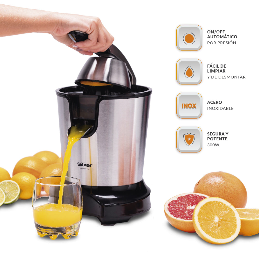 El sistema de presión, te permite exprimir cualquier fruta en un instante ejerciendo una presión sobre ella y sosteniéndola en la posición mas adecuada.